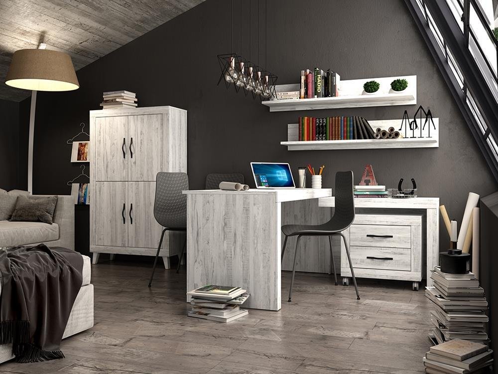 Combinación de mesa de despacho angular, para maximizar la superficie de trabajo, combinada con mueble cuatro puertas con patas,(opcionales), dos estantes pared con trasera y cajonera dos cajones y ruedas.