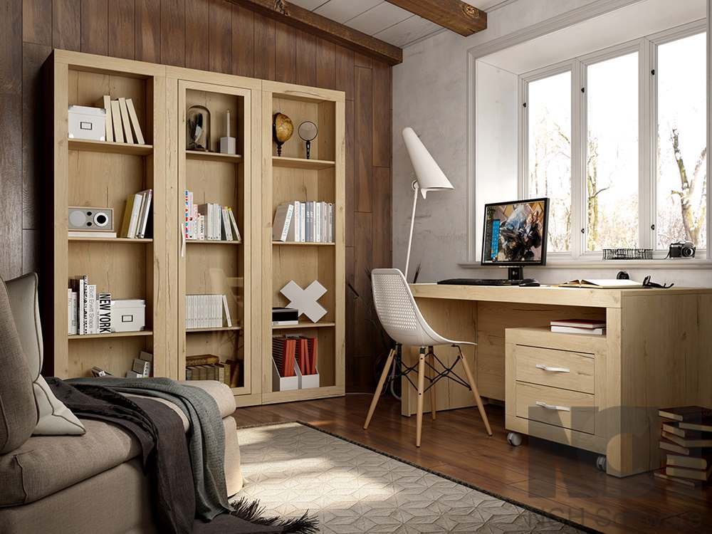 Composición diferente que combina mesa oficina con cajonera con distintos módulos como complemento, a la hora de guardar las tareas.