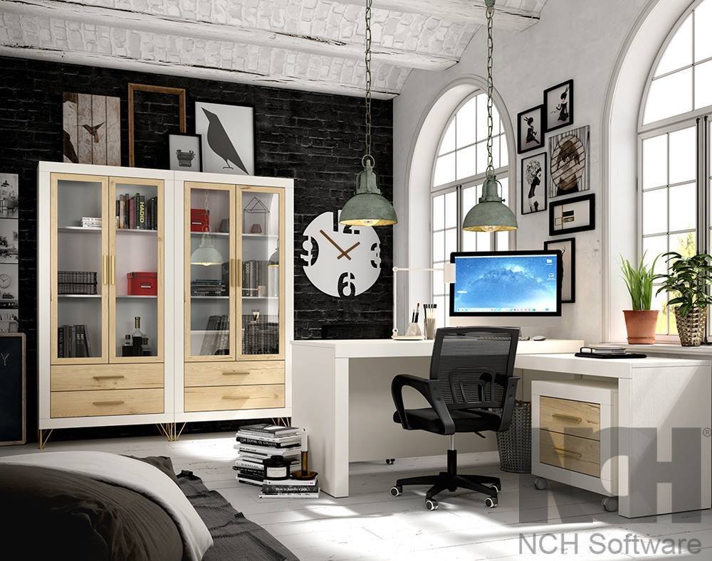 Esta composición incluye amplia mesa de despacho con cajonera y opcionalmente dos vitrinas para aumentar capacidad de almacenaje en la estancia.