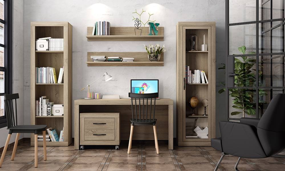 Incluye: mesa estudio con bajo dos cajones y ruedas, vitrina con puerta de cristal y baldas interiores en madera, librería, (estantes en madera), y dos estantes pared con trasera.