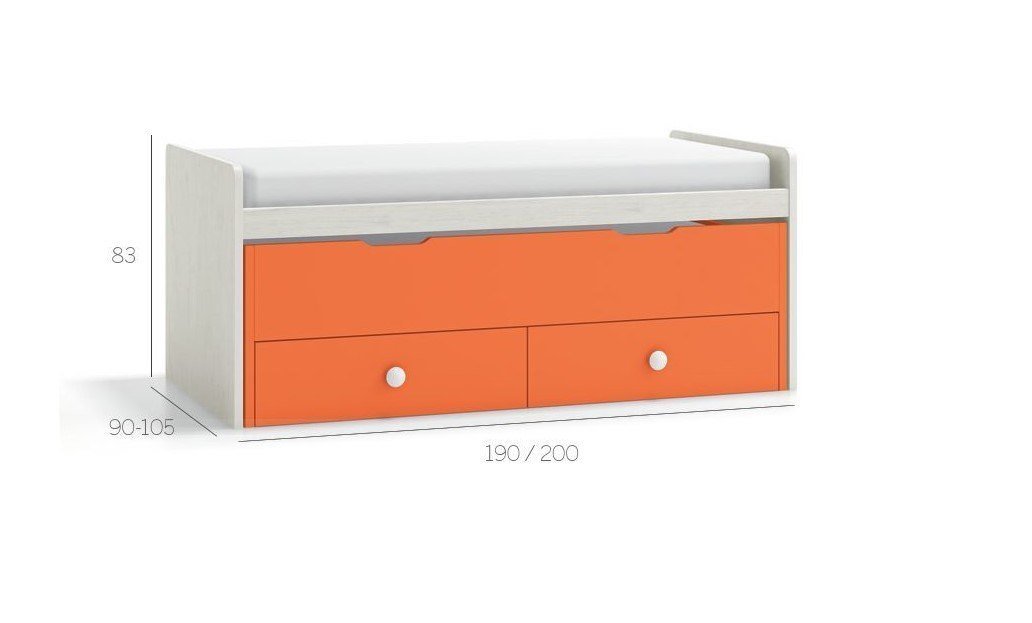 La primera cama para colchón de 90×190 con base incluida, (no necesita somier), la segunda cama oculta para colchón de 90×180, (somier no incluido), y dos amplios cajones con ruedas.
