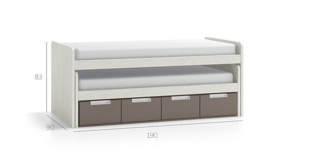 La primera cama para colchón de 90×190 con base incluida, (no necesita somier), la segunda cama para colchón de 90×180, (somier no incluido), y cuatro amplios cajones con guías correderas.