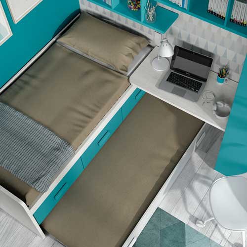 Composición con cama nido, armario y mesa angular para estudiar/trabajar con comodidad.