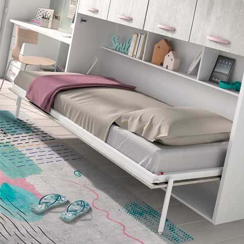 Con este concepto de diseño optimizamos al máximo el espacio con un todo en uno: cama abatible para donde nos interese más espacio libre y en el mismo volumen incorporamos el armario.