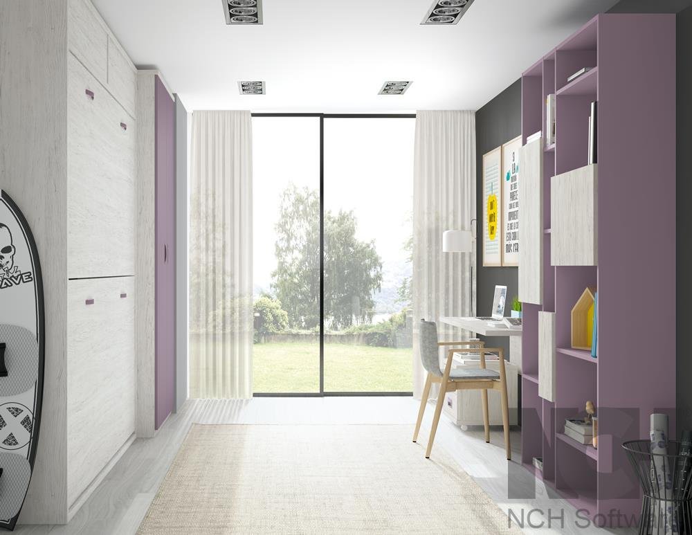 Combinación para habitación larga y estrecha, con litera abatible para despejar el ambiente y a la vez tener dos camas disponibles.