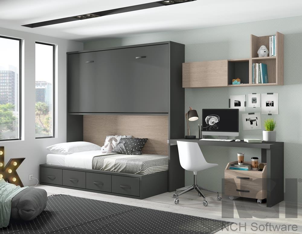 Solución innivadora para situar una cama abatible en alto, dejando la parte inferior con otra cama que a su vez incorpora cuatro cajones para aprovechar al máximo el espacio.